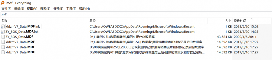 (2)由于数据库文件并不是都保存在默认安装目录,可以根据扩展名全盘搜索,并注意数据库文件的修改时间。
