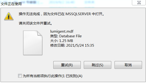 (1)若未停止数据库服务,复制会报错,无法完成数据库文件固定。