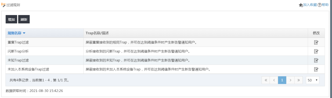 iMC&U-Center预置四种过滤规则,重复Trap、闪断Trap、系统中未定义的Trap,以及发送Trap的IP设备未被纳管到本系统的Trap,默认支持对以上四种Trap进行过滤。