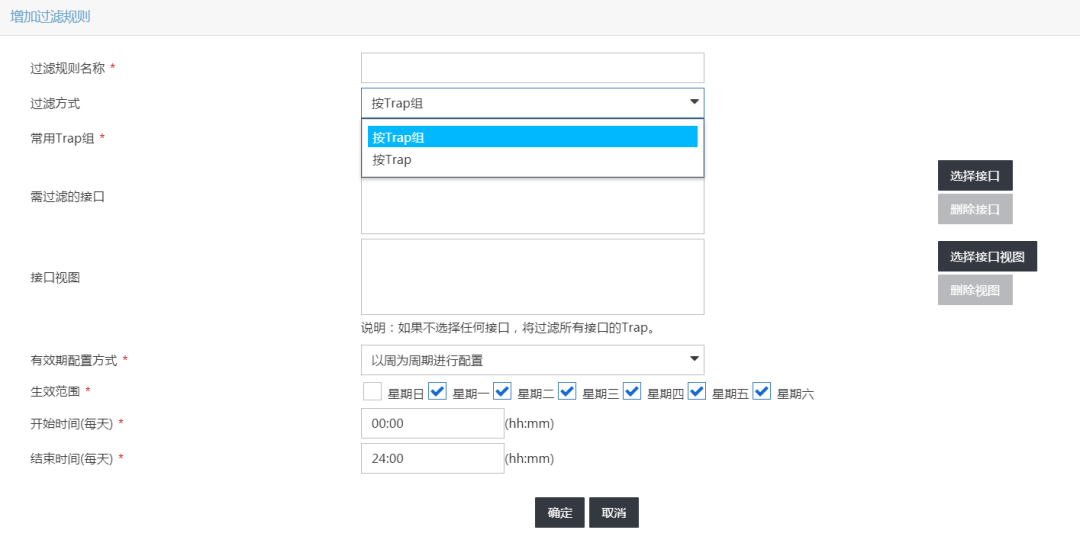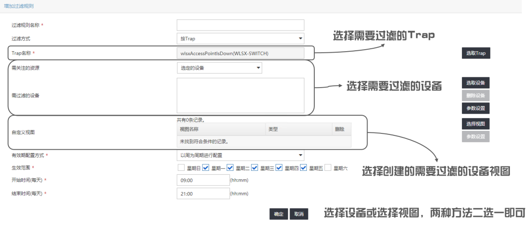 可选择特定的Trap,对特定的设备或所有设备设置过滤规则,即接收到这部分设备产生的Trap信息不产生告警。