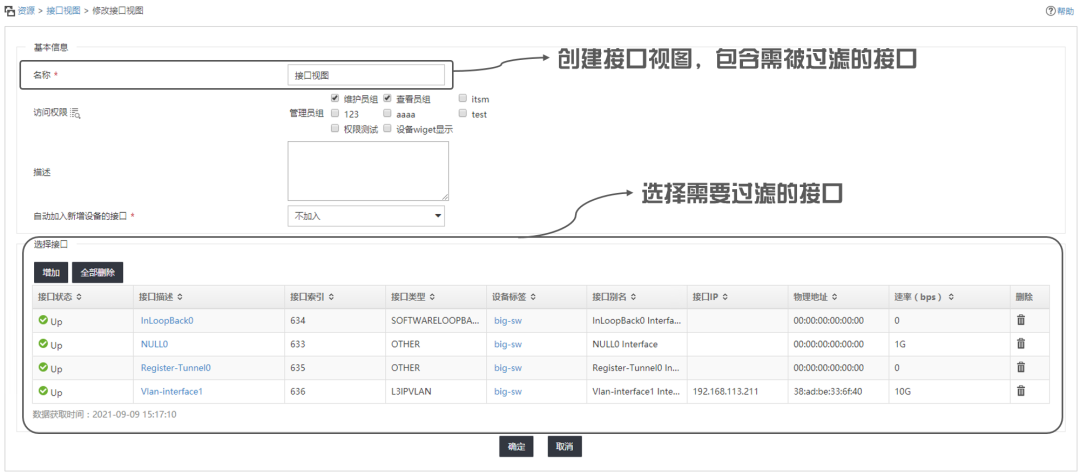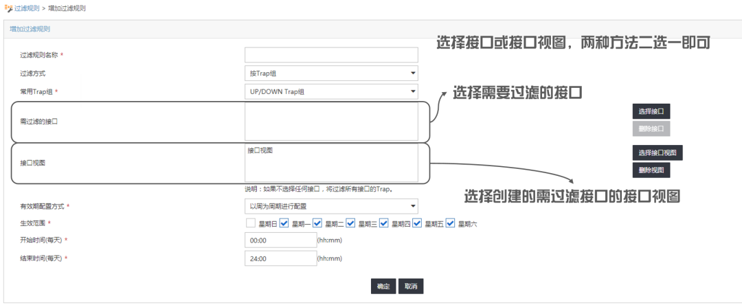 若采用UP/DOWN Trap组的方式进行过滤,则需选择过滤接口,不选择则默认过滤所有接口产生的UP/DOWN告警。选择接口支持以接口视图及选择接口两种方式。