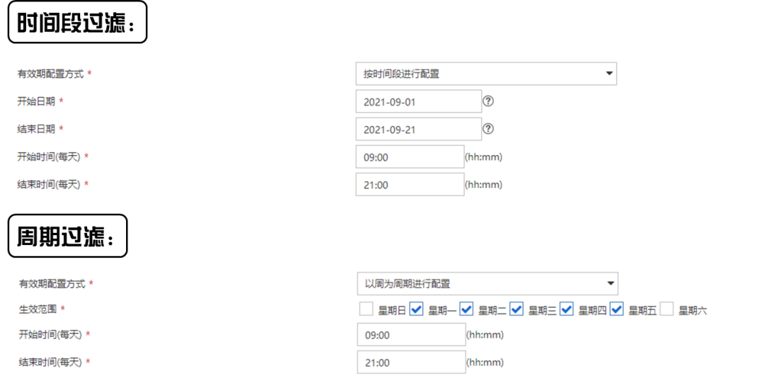 支持按时间段过滤:比如9月1日到9月20日每天9:00-21:00进行告警过滤,其余时间不进行过滤,则可以时间段的方式设置生效时间。