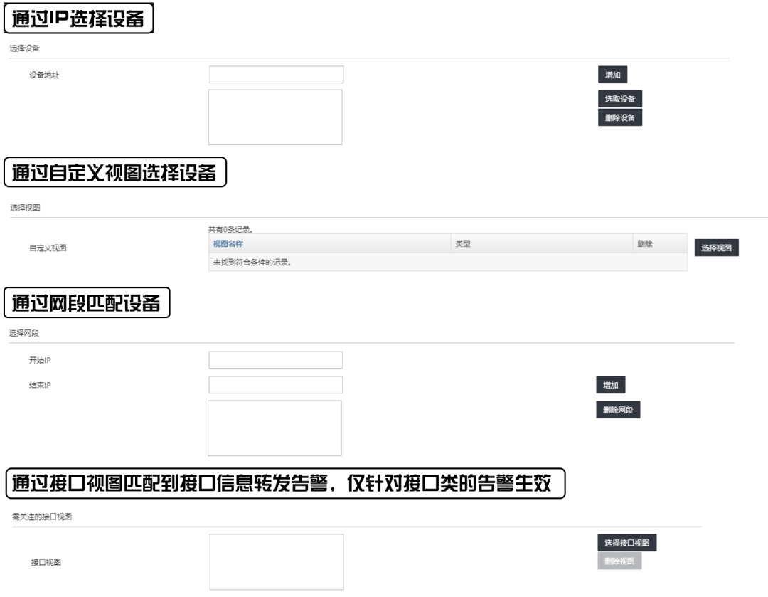 按产生告警的设备进行匹配转发告警时,支持根据IP匹配设备,根据自定义视图中的设备列表匹配设备,根据网段匹配设备,根据接口视图中的接口信息匹配(仅针对接口相关的告警生效)。匹配后将对应设备产生的所有告警进行转发。