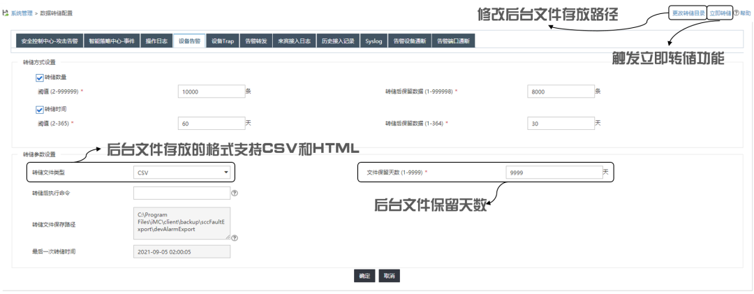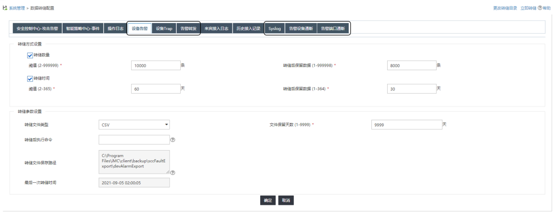 Ø 转储数量:阈值(10000),保留(8000),则当数据库中已恢复告警的数量超过10000条则触发转储功能,将数据库中的数据删除以文件的方式保留再服务器后台,数据库中则保留最新的8000条已恢复告警数据供于前台查看。