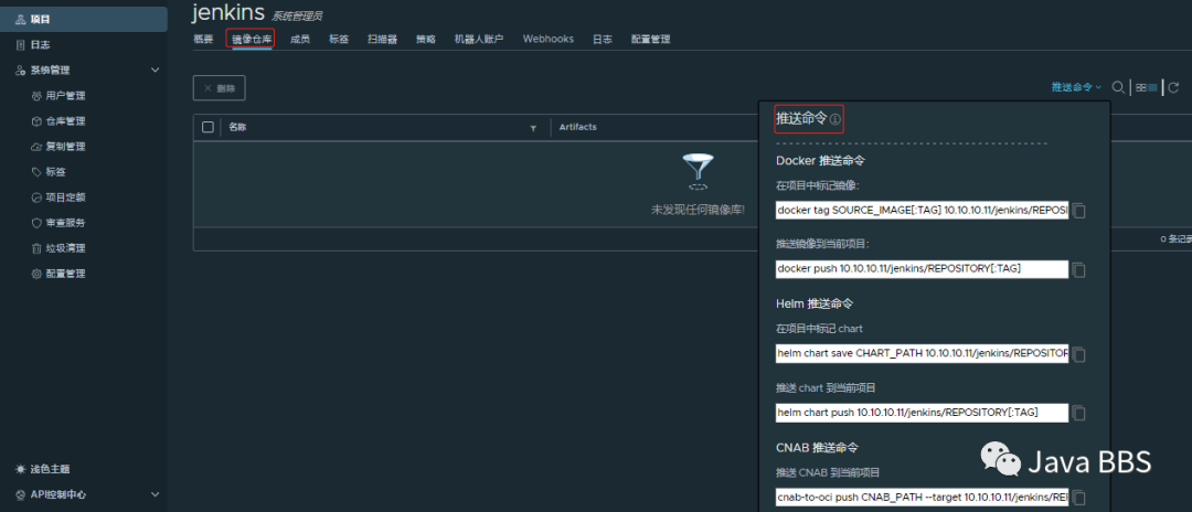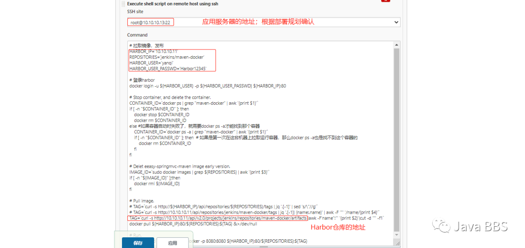 # 拉取镜像,发布HARBOR_IP='10.10.10.11'REPOSITORIES='jenkins/maven-docker'HARBOR_USER='yanqi'HARBOR_USER_PASSWD='Harbor12345'# 登录harbordocker login -u ${HARBOR_USER} -p ${HARBOR_USER_PASSWD} ${HARBOR_IP}:80# Stop container, and delete the container.CONTAINER_ID=`docker ps | grep "maven-docker" | awk '{print $1}'`if [ -n "$CONTAINER_ID" ]; thendocker stop $CONTAINER_IDdocker rm $CONTAINER_IDelse #如果容器启动时失败了,就需要docker ps -a才能找到那个容器CONTAINER_ID=`docker ps -a | grep "maven-docker" | awk '{print $1}'`if [ -n "$CONTAINER_ID" ]; then # 如果是第一次在这台机器上拉取运行容器,那么docker ps -a也是找不到这个容器的docker rm $CONTAINER_IDfifi# Delet eeasy-springmvc-maven image early version.IMAGE_ID=`sudo docker images | grep ${REPOSITORIES} | awk '{print $3}'`if [ -n "${IMAGE_ID}" ];thendocker rmi ${IMAGE_ID}fi# Pull image.# TAG=`curl -s http://${HARBOR_IP}/api/repositories/${REPOSITORIES}/tags | jq '.[-1]' | sed 's/\"//g'`# TAG=`curl -s http://10.10.10.11/api/repositories/jenkins/maven-docker/tags | jq '.[-1]| {name:.name}' | awk -F '"' '/name/{print $4}'`TAG=`curl -s http://10.10.10.11/api/v2.0/projects/jenkins/repositories/maven-docker/artifacts |awk -F'name":"' '{print $2}'|cut -d '"' -f1`docker pull ${HARBOR_IP}:80/${REPOSITORIES}:${TAG} &>/dev/null# Run.docker run -d --name maven-docker -p 8080:8080 ${HARBOR_IP}:80/${REPOSITORIES}:${TAG}#配置说明:HARBOR_IP='10.10.10.11' // Harbor的IP地址REPOSITORIES='jenkins/maven-docker' // 执行地址HARBOR_USER='yanqi' // 用户名HARBOR_USER_PASSWD='Harbor12345' // 密码docker login -u ${HARBOR_USER} -p ${HARBOR_USER_PASSWD} ${HARBOR_IP}:80 //登录地址# Pull image. //拉取镜像的操作# TAG=`curl -s http://${HARBOR_IP}/api/repositories/${REPOSITORIES}/tags | jq '.[-1]' | sed 's/\"//g'`# TAG=`curl -s http://10.10.10.11/api/repositories/jenkins/maven-docker/tags | jq '.[-1]| {name:.name}' | awk -F '"' '/name/{print $4}'`// Harbor仓库的地址;应用到了Harbor仓库的API地址TAG=`curl -s http://10.10.10.11/api/v2.0/projects/jenkins/repositories/maven-docker/artifacts |awk -F'name":"' '{print $2}'|cut -d '"' -f1`// 只要更换harbor服务器的IP地址即可,后缀目不需要更改
