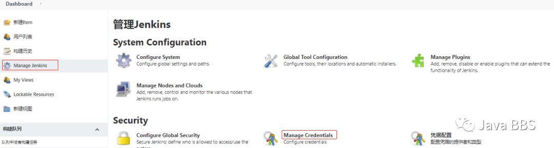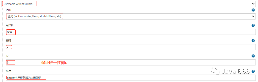 Dashboard——>Manage Jenkins——>Manage Credentials——>Jenkins:添加域:域名/描述/OK——>返回到添加凭据域列表——>docker——>添加凭据——>添加一些凭据——>确定——>END