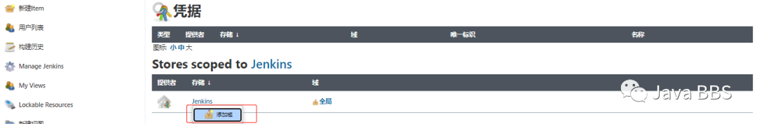 4、配置远程机器:登录Jenkins,点击“Credentials”,点击“Add domain”。
