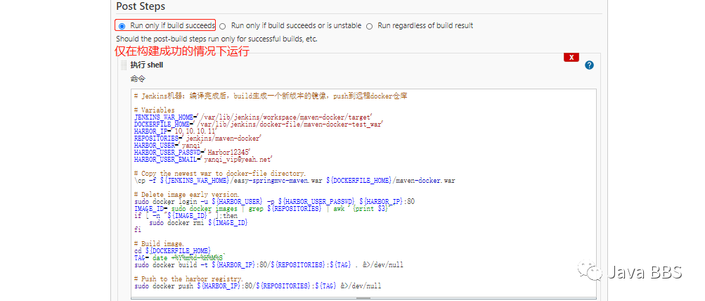 # Jenkins机器:编译完成后,build生成一个新版本的镜像,push到远程docker仓库# VariablesJENKINS_WAR_HOME='/var/lib/jenkins/workspace/maven-docker/target'DOCKERFILE_HOME='/var/lib/jenkins/docker-file/maven-docker-test_war'HARBOR_IP='10.10.10.11'REPOSITORIES='jenkins/maven-docker'HARBOR_USER='yanqi'HARBOR_USER_PASSWD='Harbor12345'HARBOR_USER_EMAIL='yanqi_vip@yeah.net'# Copy the newest war to docker-file directory.\cp -f ${JENKINS_WAR_HOME}/easy-springmvc-maven.war ${DOCKERFILE_HOME}/maven-docker.war# Delete image early version.sudo docker login -u ${HARBOR_USER} -p ${HARBOR_USER_PASSWD} ${HARBOR_IP}:80IMAGE_ID=`sudo docker images | grep ${REPOSITORIES} | awk '{print $3}'`if [ -n "${IMAGE_ID}" ];thensudo docker rmi ${IMAGE_ID}fi# Build image.cd ${DOCKERFILE_HOME}TAG=`date +%Y%m%d-%H%M%S`sudo docker build -t ${HARBOR_IP}:80/${REPOSITORIES}:${TAG} . &>/dev/null# Push to the harbor registry.sudo docker push ${HARBOR_IP}:80/${REPOSITORIES}:${TAG} &>/dev/null#配置说明:JENKINS_WAR_HOME='/var/lib/jenkins/workspace/maven-docker/target' // 定义环境变量:设置工作目录DOCKERFILE_HOME='/var/lib/jenkins/docker-file/maven-docker-test_war' // dockerfile文件创建,上面已经创建完成。HARBOR_IP='10.10.10.11' // 定义harbor服务器的地址REPOSITORIES='jenkins/maven-docker' // 库的名字HARBOR_USER='yanqi' // harbor仓库的用户名:yanqiHARBOR_USER_PASSWD='Harbor12345' // Harbor仓库的密码:Harbor12345sudo docker login -u ${HARBOR_USER} -p ${HARBOR_USER_PASSWD} ${HARBOR_IP}:80 // jenkins主机登录harbor服务器所用到的${HARBOR_USER}:Harbor主机的用户 ${HARBOR_USER_PASSWD}主机的密码 ${HARBOR_IP}:80主机的地址+端口Login Succeeded //登录成功IMAGE_ID=`sudo docker images | grep ${REPOSITORIES} | awk '{print $3}'` // IMAGE_ID,通过awk拿去第三列。作为唯一的标识sudo docker build -t ${HARBOR_IP}:80/${REPOSITORIES}:${TAG} . &>/dev/null // .标识之前的那个目录sudo docker push ${HARBOR_IP}:80/${REPOSITORIES}:${TAG} &>/dev/null //push的时候也需要端口号