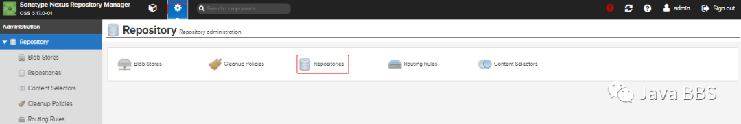 点击左侧的`repository\repositories`后,在右侧点击`create repository`