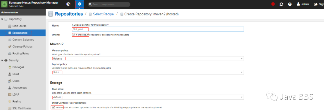 然后选择`maven2(hosted)`,填写如下——> Create repository——>END