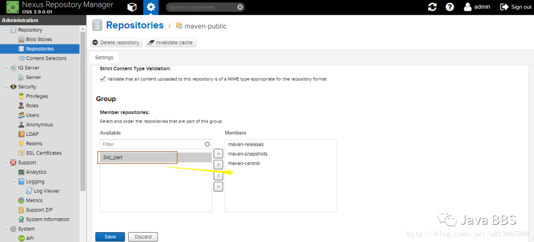 将`3rd_part`移到`members`中,即将`3rd_part`由`maven-public`管理,点击save