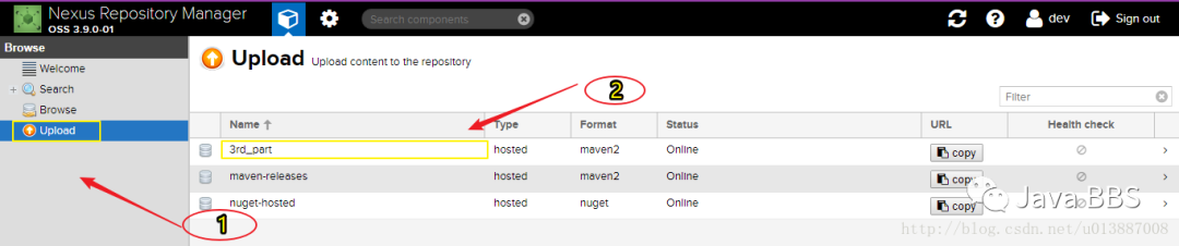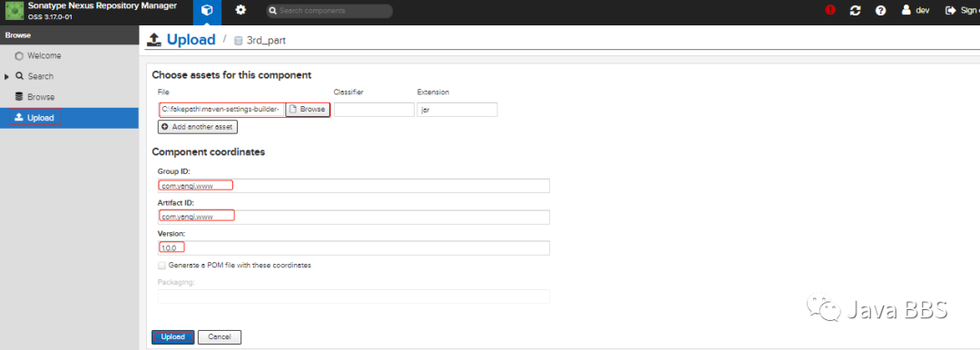 2、直接浏览器使用`dev/dev123`登陆,点击`upload`