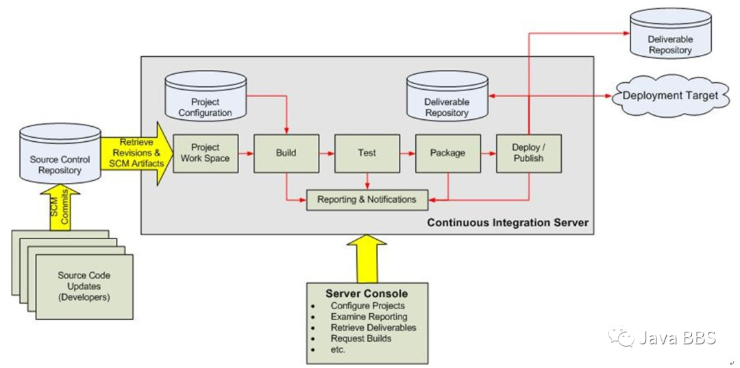 5. (配置如果存在)如果构建成功,这个构件会被打包并转移到一个部署目标(如应用服务器)或存储为软件仓库中的一个新版本。软件仓库可以是CI系统的一部分,也可以是一个外部的仓库,诸如一个文件服务器或者像Java.net、 SourceForge之类的网站。
