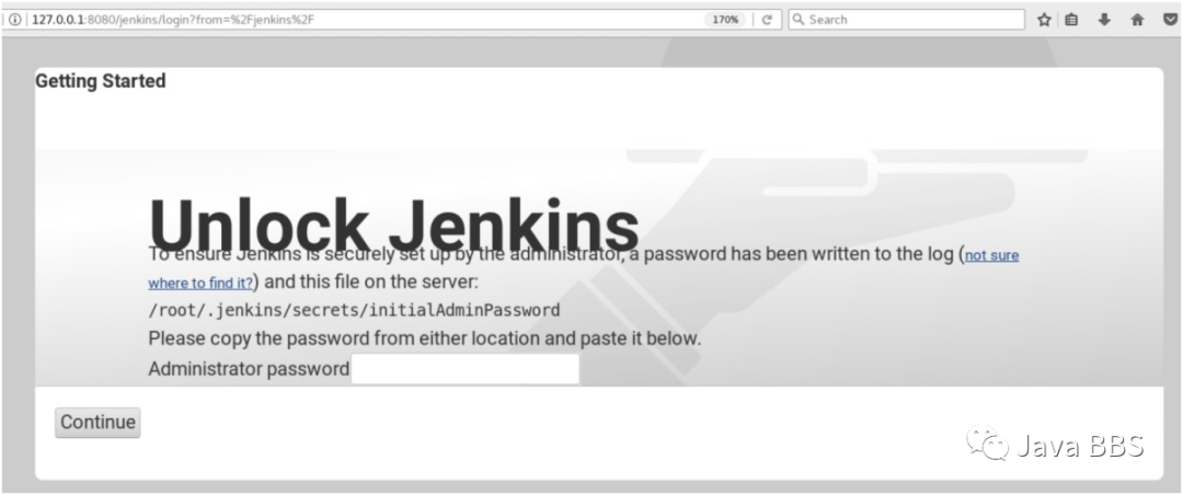 #添入以下文件密码到上图页面中[root@server11 ~]# cat /root/.jenkins/secrets/initialAdminPasswordb1a9d328f9fc41e594158124eff03bbb// 点击continue