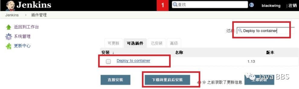 安装过程:系统管理-->插件管理-->可选插件-->过滤Deploy to container-->勾选,点击下边的按钮:直接安装,这个可能时间较久,等待即可。