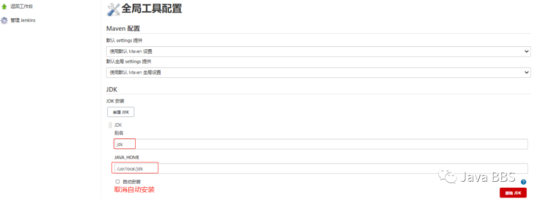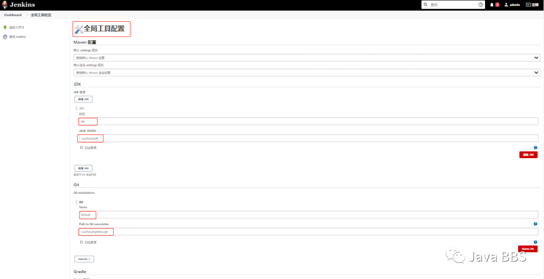 路径: 系统管理->(全局工具配置)Global Tool Configuration,配置jdk,git,maven的根目录