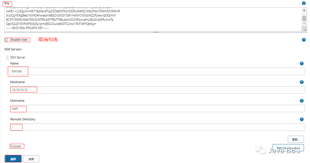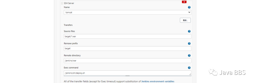 #说明name:tomcat #因为之前的配置会默认出现tomcat业务服务器的名字#source file target/*.war#构建之后,在jenkins服务器上是可以自动看到war包的。(该路径不需要创建)[root@server11 ~]# ls /root/.jenkins/jobs/yanqitest/builds/target/*.warRemove prefix #自动删除路径前缀(不需要创建路径前缀)Remote directory#tomcat业务服务器上的路径,需要提前在10.10.10.12(tomcat)上创建该目录。用来存放网站源代码。(需要后台创建)#创建文件夹[root@server12 ~]# mkdir -p /jenkins/war[root@server12 ~]# ll /jenkins/war/total 0Exec commandtomcat(10.10.10.12) #在接收到源码之后的自定义动作。#比如:将源码拷贝到网站的主目录(/jenkins),并执行一些其他操作如重启服务器等(或创建文件touch)(需要后台创建)[root@server12 ~]# mkdir /jenkins/sh[root@server12 ~]# vim /jenkins/sh/deploy.sh#!/bin/bashtouch /root/www.yanqi.com[root@server12 ~]# chmod +x /jenkins/sh/deploy.sh#保存即可