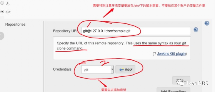 #报错:如果是私有库,必须添加一个CredentialsFailed to connect to repository : Command "/usr/local/git/bin/git -c core.askpass=true ls-remote -h http://www.xxx.com/gitlab/root/test.git HEAD" returned status code 128:stdout:stderr: fatal: Unable to find remote helper for 'http'#或者Failed to connect to repository : Command "git ls-remote -h git@xxxxx.com:xxx/dev_test.git HEAD" returned status code 128:stdout:stderr: Permission denied, please tryagain.Permission denied, please try again.Permission denied(publickey,gssapi-keyex,gssapi-with-mic,password).fatal: The remote end hung up unexpectedly原因:没有配置git的ssh key。#解决方法:执行下面的命令,生成keyssh-keygen -t rsa -C "admin@example.com"#然后将~/.ssh/目录下的id_rsa.pub中的公钥,放到git的ssh key中。再在Jenkins中创建新的Credentials。类型是SSH Username with private key。Username使用ssh-keygen中用到的邮箱,Private Key中选择“From the Jenkins master ~/.ssh”即可。修改后,问题解决。#创建credentials#步骤1:// 在 jenkins 中使用 git 插件从仓库中 pull 代码的时候会要求 jenkins 必须有 pull 权限(尤其是当git开启了ssh认证的时候),在配置 jenkins job 的时候有以下这些方法配置 ssh key:// 登陆 jenkins 服务器,切换到 jenkins 用户(wing直接使用的root账户),生成 ssh key,然后把 公钥添加到 git 服务器上.// su - jenkins //切换到 jenkins HOME 目录// ssh-keygen -t rsa // 生成 ssh key, 复制 xxx.pub 公钥到 git 服务器上即可.#步骤2:在jenkins界面,依次点击:Credentials -> System -> Add domain:// Domain Name: 填写你git服务器的地址,如 github.xxx.com(wing填写的IP地址,127.0.0.1)// Description: 随便写一点描述,如 This is the Credential for github#// 如图