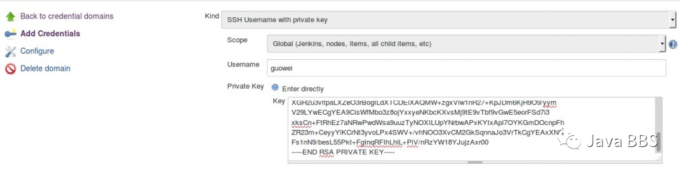 // 点击 ok 后,再点击 “adding some credentials?”// 进入页面后,可以选择 Username with password 或者 SSH Username with private key, 根据你的情况选择,这里我们选择 Username with private key:// Username: 随便起一个名字,以便在创建 Job 的时候使用该 Credential// Private Key:可以指定文件,也可以使用默认的 ~/.ssh,当然也可以直接将私钥复制粘贴到此处。// Passphrase: 如果你在创建 ssh key 的时候输入了 Passphrase 那就填写相应的Passphrase,为空就不填写#ID: 空#Description:空