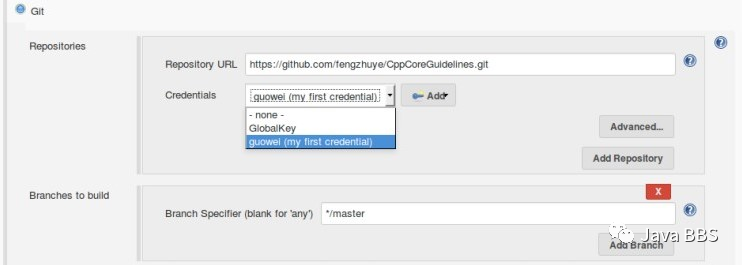 点击 ok 后 Credential 就创建好了。如果你再新建 Job 就可以看到我们的 Credential 选项了: