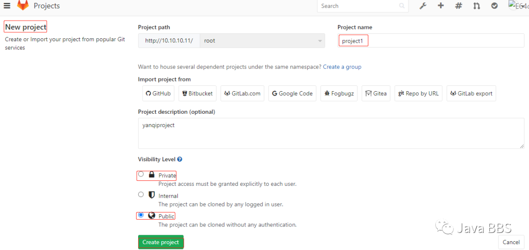 创建项目:左上角菜单:Projects——>New project——>Project name:project1——>描述:自己填写——>Private:Public都可以——>Create project——>END