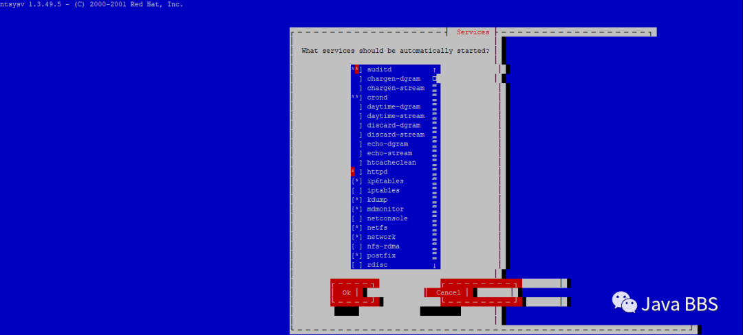 | ntpd | 该服务可以通过互联网自动更新系统时间,使系统时间永远都准确。需要则开启,但不是必须服务 | 关闭 |
