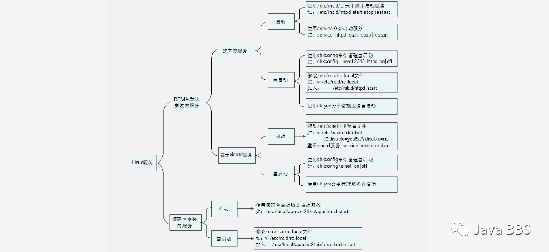 #服务分类:#一、RPM包安装的服务:#1、独立的服务:// 启动:[root@localhost ~]# /etc/rc.d/init.d/httpd star|stop|restart[root@localhost ~]# service httpd start// 自启动:[root@localhost ~]# chkconfig --level 2345 httpd on[root@localhost ~]# vim /etc/rc.d/rc.local (推荐)/etc/rc.d/init.d/httpd start#2、基于xinetd的服务// 启动:[root@localhost ~]# vim /etc/xinetd.d/telnetdisable = yes 改为 disable = no// 自启动:[root@localhost ~]# chkconfig telnet on #不可以写入运行级别号,它是基于xinetd服务的。[root@localhost ~]# ntsysv#二、源码包安装的服务//启动:[root@localhost ~]# /usr/local/apache2/bin/apachectl start|stop|restart|…//自启动:[root@localhost ~]# vim /etc/rc.d/rc.local/usr/local/apache2/bin/apachectl start