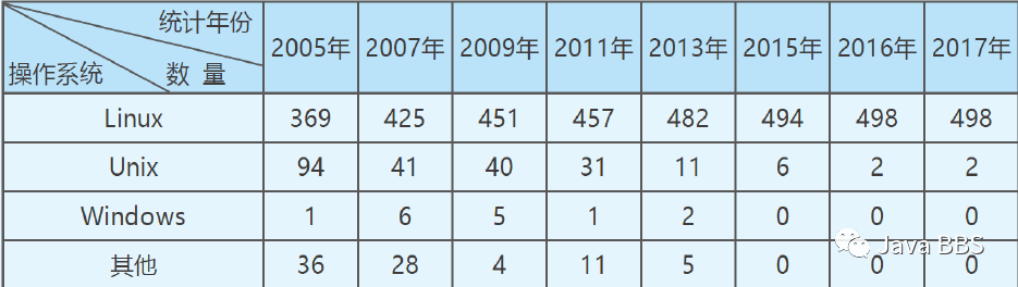 世界超级计算机500强,操作系统量比趋势分析(数据来源:超算中心官网http://top500.org