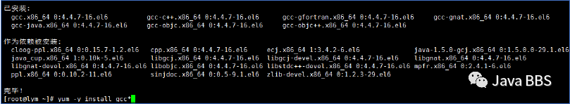 [root@server21 ~]# yum install -y gcc*Installed:gcc.x86_64 0:4.4.7-17.el6 gcc-c++.x86_64 0:4.4.7-17.el6 gcc-gfortran.x86_64 0:4.4.7-17.el6 gcc-gnat.x86_64 0:4.4.7-17.el6 gcc-java.x86_64 0:4.4.7-17.el6gcc-objc.x86_64 0:4.4.7-17.el6 gcc-objc++.x86_64 0:4.4.7-17.el6Dependency Installed:alsa-lib.x86_64 0:1.1.0-4.el6 atk.x86_64 0:1.30.0-1.el6 avahi-libs.x86_64 0:0.6.25-15.el6 cairo.x86_64 0:1.8.8-6.el6_6cloog-ppl.x86_64 0:0.15.7-1.2.el6 cpp.x86_64 0:4.4.7-17.el6 cups-libs.x86_64 1:1.4.2-74.el6 ecj.x86_64 1:3.4.2-6.el6fontconfig.x86_64 0:2.8.0-5.el6 freetype.x86_64 0:2.3.11-17.el6 gdk-pixbuf2.x86_64 0:2.24.1-6.el6_7 glibc-devel.x86_64 0:2.12-1.192.el6glibc-headers.x86_64 0:2.12-1.192.el6 gnutls.x86_64 0:2.8.5-19.el6_7 gtk2.x86_64 0:2.24.23-8.el6 hicolor-icon-theme.noarch 0:0.11-1.1.el6jasper-libs.x86_64 0:1.900.1-16.el6_6.3 java-1.5.0-gcj.x86_64 0:1.5.0.0-29.1.el6 java_cup.x86_64 1:0.10k-5.el6 jpackage-utils.noarch 0:1.7.5-3.16.el6kernel-headers.x86_64 0:2.6.32-642.el6 libICE.x86_64 0:1.0.6-1.el6 libSM.x86_64 0:1.2.1-2.el6 libX11.x86_64 0:1.6.3-2.el6libX11-common.noarch 0:1.6.3-2.el6 libXau.x86_64 0:1.0.6-4.el6 libXcomposite.x86_64 0:0.4.3-4.el6 libXcursor.x86_64 0:1.1.14-2.1.el6libXdamage.x86_64 0:1.1.3-4.el6 libXext.x86_64 0:1.3.3-1.el6 libXfixes.x86_64 0:5.0.1-2.1.el6 libXft.x86_64 0:2.3.2-1.el6libXi.x86_64 0:1.7.4-1.el6 libXinerama.x86_64 0:1.1.3-2.1.el6 libXrandr.x86_64 0:1.4.2-1.el6 libXrender.x86_64 0:0.9.8-2.1.el6libXtst.x86_64 0:1.2.2-2.1.el6 libart_lgpl.x86_64 0:2.3.20-5.1.el6 libgcj.x86_64 0:4.4.7-17.el6 libgcj-devel.x86_64 0:4.4.7-17.el6libgfortran.x86_64 0:4.4.7-17.el6 libgnat.x86_64 0:4.4.7-17.el6 libgnat-devel.x86_64 0:4.4.7-17.el6 libgomp.x86_64 0:4.4.7-17.el6libjpeg-turbo.x86_64 0:1.2.1-3.el6_5 libobjc.x86_64 0:4.4.7-17.el6 libpng.x86_64 2:1.2.49-2.el6_7 libstdc++-devel.x86_64 0:4.4.7-17.el6libthai.x86_64 0:0.1.12-3.el6 libtiff.x86_64 0:3.9.4-10.el6_5 libxcb.x86_64 0:1.11-2.el6 mpfr.x86_64 0:2.4.1-6.el6pango.x86_64 0:1.28.1-11.el6 pixman.x86_64 0:0.32.8-1.el6 ppl.x86_64 0:0.10.2-11.el6 sinjdoc.x86_64 0:0.5-9.1.el6zip.x86_64 0:3.0-1.el6_7.1 zlib-devel.x86_64 0:1.2.3-29.el6Complete!