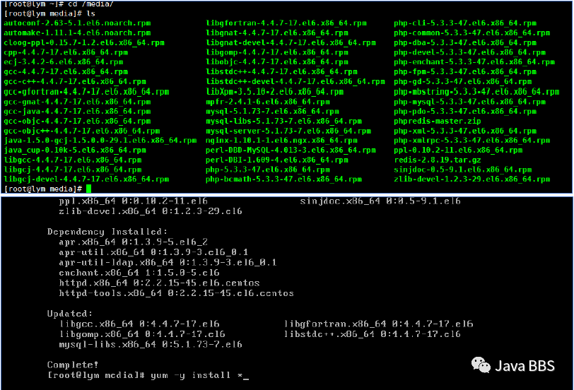 #将redis-mysql.zip上传至服务器[root@server21 ~]# lsredis-mysql.zip[root@server21 ~]# unzip redis-mysql.zip[root@server21 ~]# cd redis-mysql[root@server21 redis-mysql]# lsautoconf-2.63-5.1.el6.noarch.rpm java_cup-0.10k-5.el6.x86_64.rpm mysql-5.1.73-7.el6.x86_64.rpm php-fpm-5.3.3-47.el6.x86_64.rpmautomake-1.11.1-4.el6.noarch.rpm libgcc-4.4.7-17.el6.x86_64.rpm mysql-libs-5.1.73-7.el6.x86_64.rpm php-gd-5.3.3-47.el6.x86_64.rpmcloog-ppl-0.15.7-1.2.el6.x86_64.rpm libgcj-4.4.7-17.el6.x86_64.rpm mysql-server-5.1.73-7.el6.x86_64.rpm php-mbstring-5.3.3-47.el6.x86_64.rpmcpp-4.4.7-17.el6.x86_64.rpm libgcj-devel-4.4.7-17.el6.x86_64.rpm nginx-1.10.1-1.el6.ngx.x86_64.rpm php-mysql-5.3.3-47.el6.x86_64.rpmecj-3.4.2-6.el6.x86_64.rpm libgfortran-4.4.7-17.el6.x86_64.rpm perl-DBD-MySQL-4.013-3.el6.x86_64.rpm php-pdo-5.3.3-47.el6.x86_64.rpmgcc-4.4.7-17.el6.x86_64.rpm libgnat-4.4.7-17.el6.x86_64.rpm perl-DBI-1.609-4.el6.x86_64.rpm phpredis-master.zipgcc-c++-4.4.7-17.el6.x86_64.rpm libgnat-devel-4.4.7-17.el6.x86_64.rpm php-5.3.3-47.el6.x86_64.rpm php-xml-5.3.3-47.el6.x86_64.rpmgcc-gfortran-4.4.7-17.el6.x86_64.rpm libgomp-4.4.7-17.el6.x86_64.rpm php-bcmath-5.3.3-47.el6.x86_64.rpm php-xmlrpc-5.3.3-47.el6.x86_64.rpmgcc-gnat-4.4.7-17.el6.x86_64.rpm libobjc-4.4.7-17.el6.x86_64.rpm php-cli-5.3.3-47.el6.x86_64.rpm ppl-0.10.2-11.el6.x86_64.rpmgcc-java-4.4.7-17.el6.x86_64.rpm libstdc++-4.4.7-17.el6.x86_64.rpm php-common-5.3.3-47.el6.x86_64.rpm redis-2.8.19.tar.gzgcc-objc-4.4.7-17.el6.x86_64.rpm libstdc++-devel-4.4.7-17.el6.x86_64.rpm php-dba-5.3.3-47.el6.x86_64.rpm sinjdoc-0.5-9.1.el6.x86_64.rpmgcc-objc++-4.4.7-17.el6.x86_64.rpm libXpm-3.5.10-2.el6.x86_64.rpm php-devel-5.3.3-47.el6.x86_64.rpm zlib-devel-1.2.3-29.el6.x86_64.rpmjava-1.5.0-gcj-1.5.0.0-29.1.el6.x86_64.rpm mpfr-2.4.1-6.el6.x86_64.rpm php-enchant-5.3.3-47.el6.x86_64.rpm[root@server21 redis-mysql]# yum install -y *Installed:autoconf.noarch 0:2.63-5.1.el6 automake.noarch 0:1.11.1-4.el6 libXpm.x86_64 0:3.5.10-2.el6 mysql.x86_64 0:5.1.73-7.el6 mysql-server.x86_64 0:5.1.73-7.el6nginx.x86_64 0:1.10.1-1.el6.ngx perl-DBD-MySQL.x86_64 0:4.013-3.el6 perl-DBI.x86_64 0:1.609-4.el6 php.x86_64 0:5.3.3-47.el6 php-bcmath.x86_64 0:5.3.3-47.el6php-cli.x86_64 0:5.3.3-47.el6 php-common.x86_64 0:5.3.3-47.el6 php-dba.x86_64 0:5.3.3-47.el6 php-devel.x86_64 0:5.3.3-47.el6 php-enchant.x86_64 0:5.3.3-47.el6php-fpm.x86_64 0:5.3.3-47.el6 php-gd.x86_64 0:5.3.3-47.el6 php-mbstring.x86_64 0:5.3.3-47.el6 php-mysql.x86_64 0:5.3.3-47.el6 php-pdo.x86_64 0:5.3.3-47.el6php-xml.x86_64 0:5.3.3-47.el6 php-xmlrpc.x86_64 0:5.3.3-47.el6Dependency Installed:apr.x86_64 0:1.3.9-5.el6_2 apr-util.x86_64 0:1.3.9-3.el6_0.1 apr-util-ldap.x86_64 0:1.3.9-3.el6_0.1 enchant.x86_64 1:1.5.0-5.el6httpd.x86_64 0:2.2.15-53.el6.centos httpd-tools.x86_64 0:2.2.15-53.el6.centos hunspell.x86_64 0:1.2.8-16.el6 libedit.x86_64 0:2.11-4.20080712cvs.1.el6libxslt.x86_64 0:1.1.26-2.el6_3.1 mailcap.noarch 0:2.1.31-2.el6Complete!