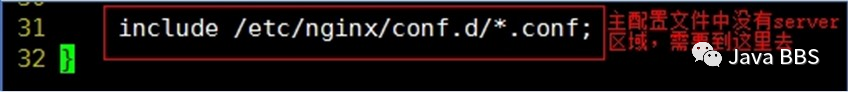 [root@server21 ~]# vim /etc/nginx/nginx.confinclude /etc/nginx/conf.d/*.conf; #主配置文件中没有server区域,需要到这里去,默认已经开启状态;