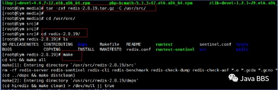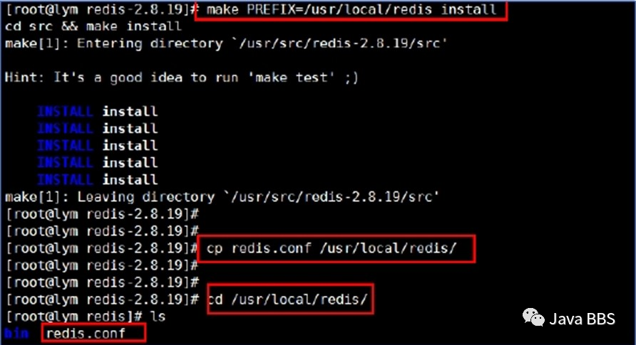 [root@server21 ~]# cd redis-mysql[root@server21 redis-mysql]# tar -zxvf redis-2.8.19.tar.gz[root@server21 redis-mysql]# cd redis-2.8.19[root@server21 redis-2.8.19]# make[root@server21 redis-2.8.19]# make PREFIX=/usr/local/redis installcd src && make installmake[1]: Entering directory `/root/redis-mysql/redis-2.8.19/src'Hint: It's a good idea to run 'make test' ;)INSTALL installINSTALL installINSTALL installINSTALL installINSTALL installmake[1]: Leaving directory `/root/redis-mysql/redis-2.8.19/src'[root@server21 redis-2.8.19]# cp -a redis.conf /usr/local/redis/