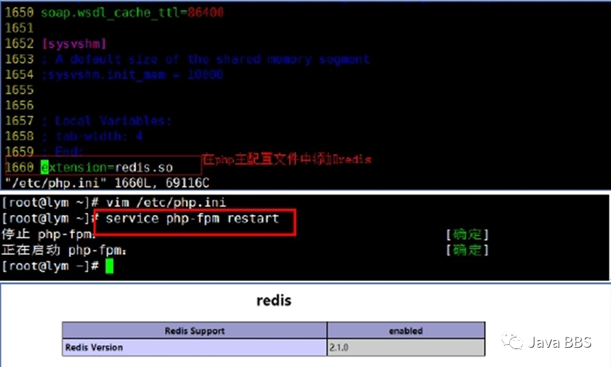 [root@server21 phpredis-master]# vim /etc/php.iniextension=redis.so #在末尾添加如下内容 #在PHP主配置文件中添加Redis[root@server21 phpredis-master]# service php-fpm restartStopping php-fpm: [ OK ]Starting php-fpm: [ OK ]#刷新http://20.20.20.21/输出Redis配置,说明配置OK