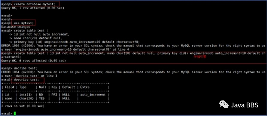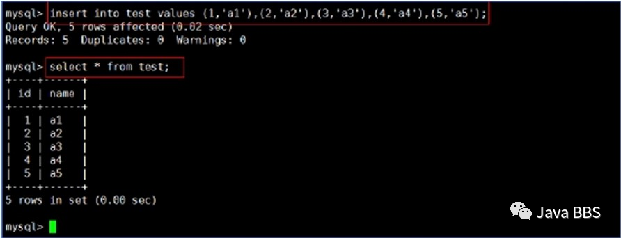 [root@server21 ~]# mysql -uroot -p123456#创建一个mytest库mysql> create database mytest;Query OK, 1 row affected (0.00 sec)mysql> use mytest;Database changedmysql> create table test (id int,name char(20));Query OK, 0 rows affected (0.07 sec)mysql> insert into test values (1,'a1'),(2,'a2'),(3,'a3'),(4,'a4'),(5,'a5');Query OK, 5 rows affected (0.00 sec)Records: 5 Duplicates: 0 Warnings: 0mysql> select * from test;+------+------+| id | name |+------+------+| 1 | a1 || 2 | a2 || 3 | a3 || 4 | a4 || 5 | a5 |+------+------+5 rows in set (0.00 sec)