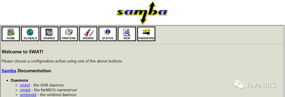 //将samba图形化界面程序包导入服务器samba-swat.tar.gz[root@server21 ~]# tar -zxvf samba-swat.tar.gz[root@server21 ~]# cd samba-swat //这些程序包是el6的,只能在centos6.x下使用,centos7.x是不可以使用的。//1、安装(导入程序包)[root@server21 samba-swat]# yum install -y * //安装程序包,下面两个软件包必须安装samba-swatxinetd//2、修改/etc/xinetd.d/swat[root@server21 ~]# vim /etc/xinetd.d/swat添加:only_from = 20.20.20.240 //修改登录来源IP地址disable = no //disable no是不禁止,disable yes是禁止//3、重启xinetd服务[root@server21 ~]# service xinetd restart[root@server21 ~]# chkconfig --list xinetdxinetd 0:off 1:off 2:off 3:on 4:on 5:on 6:off //默认开机自启[root@server21 ~]# netstat -antp //查看901端口是否开启tcp 0 0 :::901 :::* LISTEN 2050/xinetd//4、测试http://20.20.20.21:901/