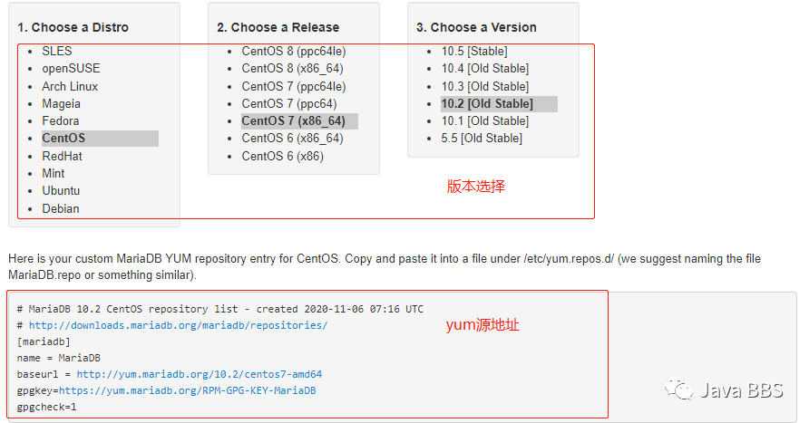 centos下安装mariadb官方手册: https://downloads.mariadb.org/mariadb/repositories/
