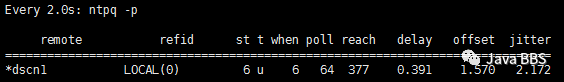 remote:本机和上层ntp的ip或主机名,“+”表示优先,“*”表示次优先refid:参考上一层ntp主机地址st:stratum阶层when:多少秒前曾经同步过时间poll:下次更新在多少秒后reach:已经向上层ntp服务器要求更新的次数delay:网络延迟offset:时间补偿jitter:系统时间与bios时间差