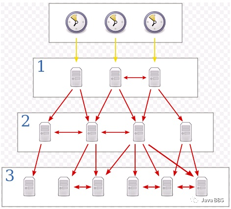 往后的stratum与上一层stratum通过网络相连,同一层的server也可以交互。