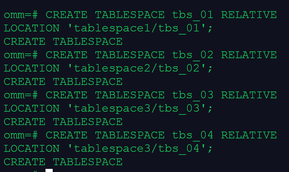 CREATE TABLESPACE tbs_01 RELATIVE LOCATION 'tablespace1/tbs_01';