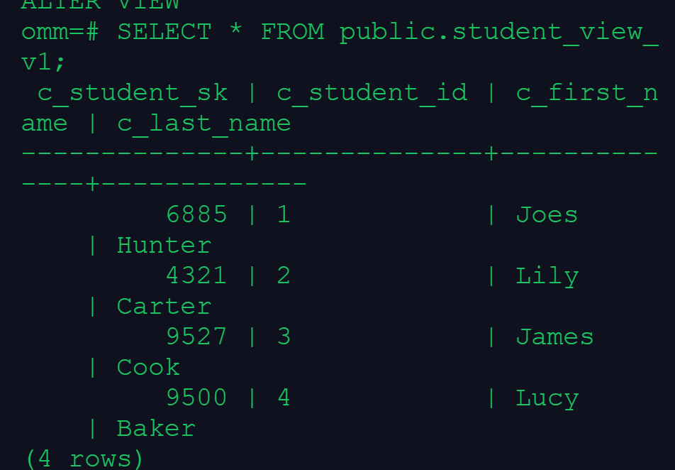 2.创建一个用户表student,并在用户表上创建视图,修改视图schema;