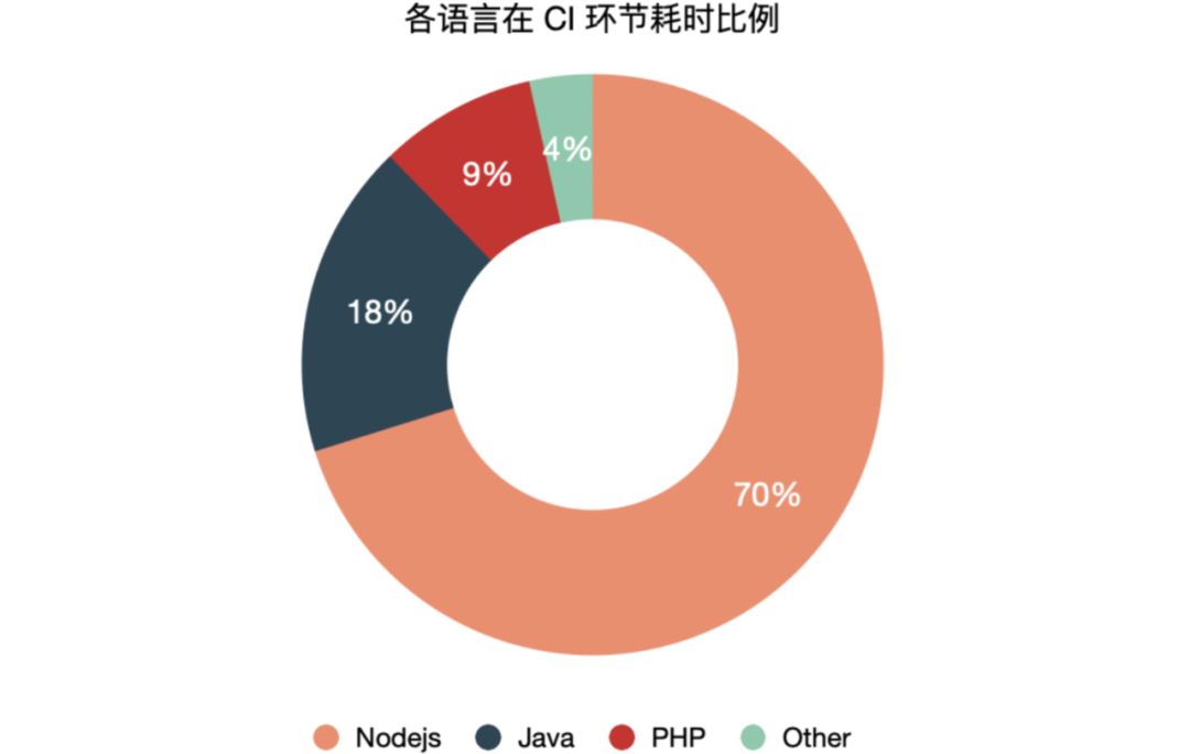 按我们的主流开发语言项目的发布耗时来看,其中耗时最⻓的是Nodejs,占比达到了70%,按照2/8原则来看, 我们只需要花少量的精力来优化成体速度的提升,侧重点是关注Nodejs的项目的发布速度。