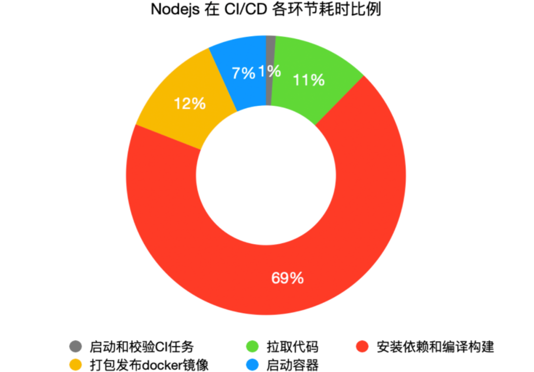 通过在流水线中各位环节打标时间戳,采集了大量的日志数据后,我们分析发现,Nodejs项目在CI/CD过程中耗时最⻓的是在安装依赖和编译构建中。安装依赖的时间大量消耗在了npm install上面了,即便是我们有自己的私有npm仓库但还是消耗了大量的时间。