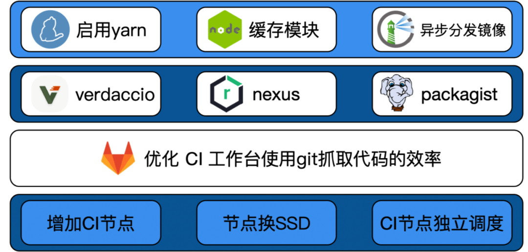 要求各业务线的项目启用在内部搭建的软件源,尽量不要使用外部软件源,减少等待外部网络的下载时间。Nodejs使用verdaccio来搭建内部源并且设置国内的Nodejs源作为上游,拉取到的包就会缓存到本地服务器,大大减少了不必要的网络开销。Java和PHP分别使用了nexus和packagist。