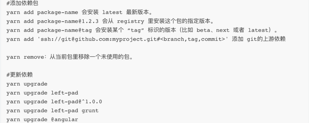 注意这些操作都可以自动增量更新package.json和yarn.lock中的依赖关系。为了不破坏yarn.lock的正确性,此文件不要手动去修改。需要使用上游更新后的包,要使用yarn upgrade来引用最新的上游依赖。