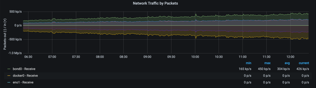 Metric 可以通过 label 来进行选择,比如 node_network_receive_packets_total{device=”bond0″} 就会只查询到 bond0 的数据,绘制 bond0 这个 device 的曲线。也支持正则表达式,可以通过 node_network_receive_packets_total{device=~”en.*”} 绘制 en0 和 en2 的曲线。
