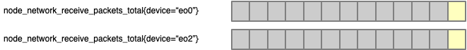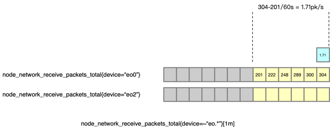 假如我们对 Prometheus 的采集配置是每 10s 采集一次,那么 1 分钟内就会有采集 6 次,就会有 6 个数据点。我们使用 node_network_receive_packets_total{device=~“.*”}[1m] 查询的话,就可以得到以下的数据:两个 metric,最后的 6 个数据点。