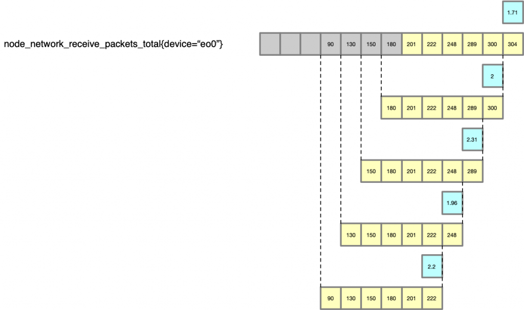 所以这个 PromQL 查询最终得到的数据点是:… 2.2, 1.96, 2.31, 2, 1.71 (即蓝色的点)。