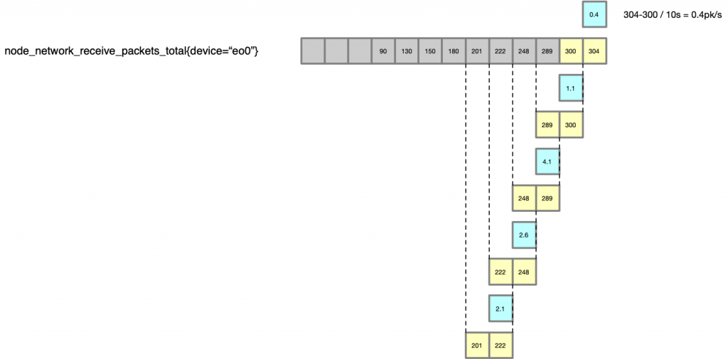 先来看一个时间点的计算,假如我们计算 t 时间点的每秒 packet 数量,rate 函数可以帮我们用这段时间([1m]