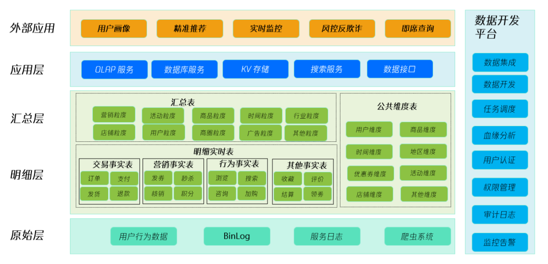 我们知道,数据仓库(Data Warehouse)是面向主题的、集成的一套系统。它遵循一系列的建模规范,每层致力于解决不同的问题。下图是一个典型的实时数仓架构,它分为外部应用、应用层(ADS或APP)、汇总层(DWS)、明细层(DWD)和维度层(DIM),以及原始数据层(ODS)。我们以电商行业的互联网精准营销为例子,讲解一下典型的实时数仓结构。