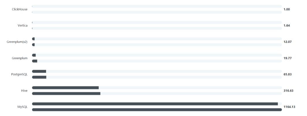 下图是1亿条数据量级下,ClickHouse与多种常见数据处理系统的查询速度对比图(数字越小代表耗时越短,性能越好),可以看到ClickHouse的性能数据遥遥领先: